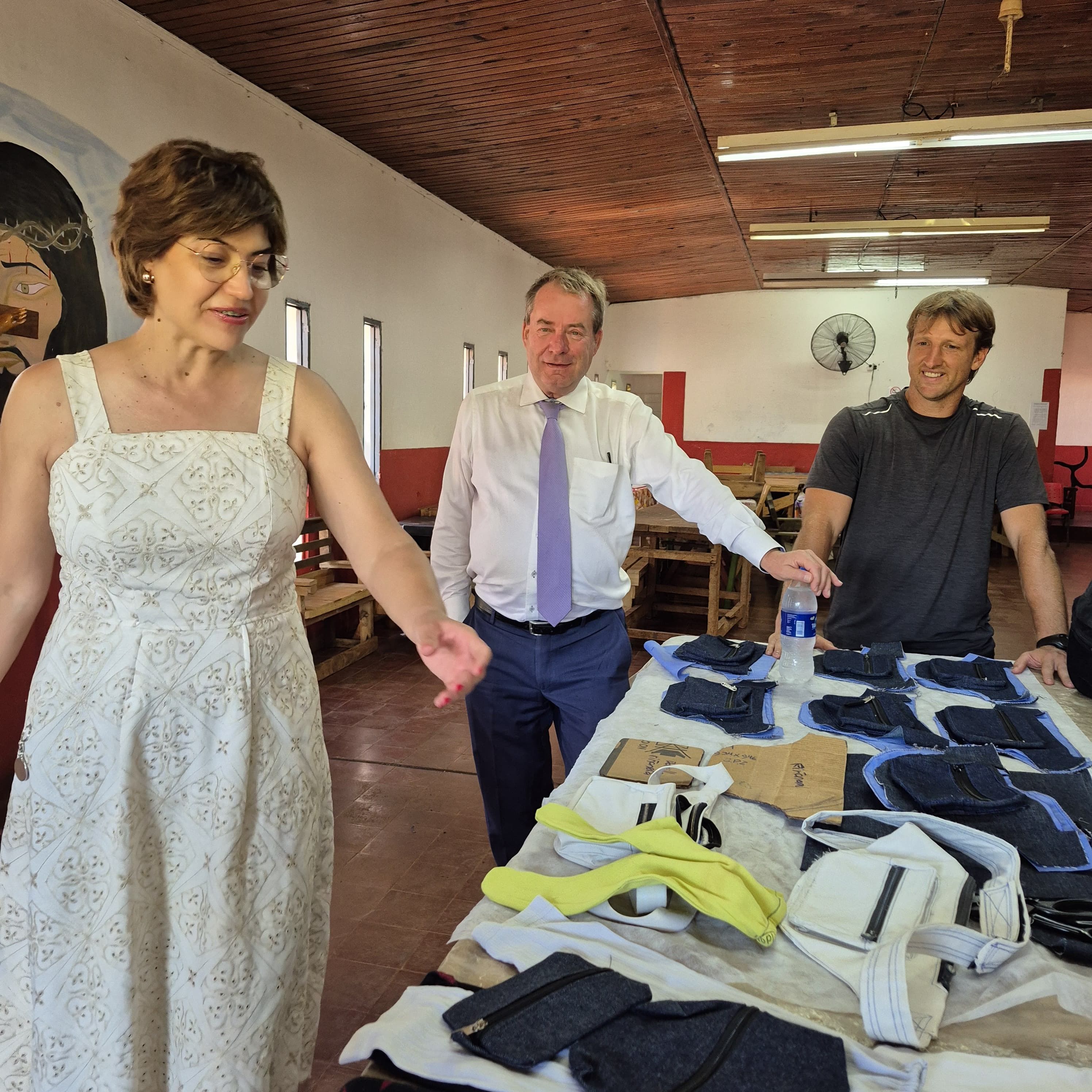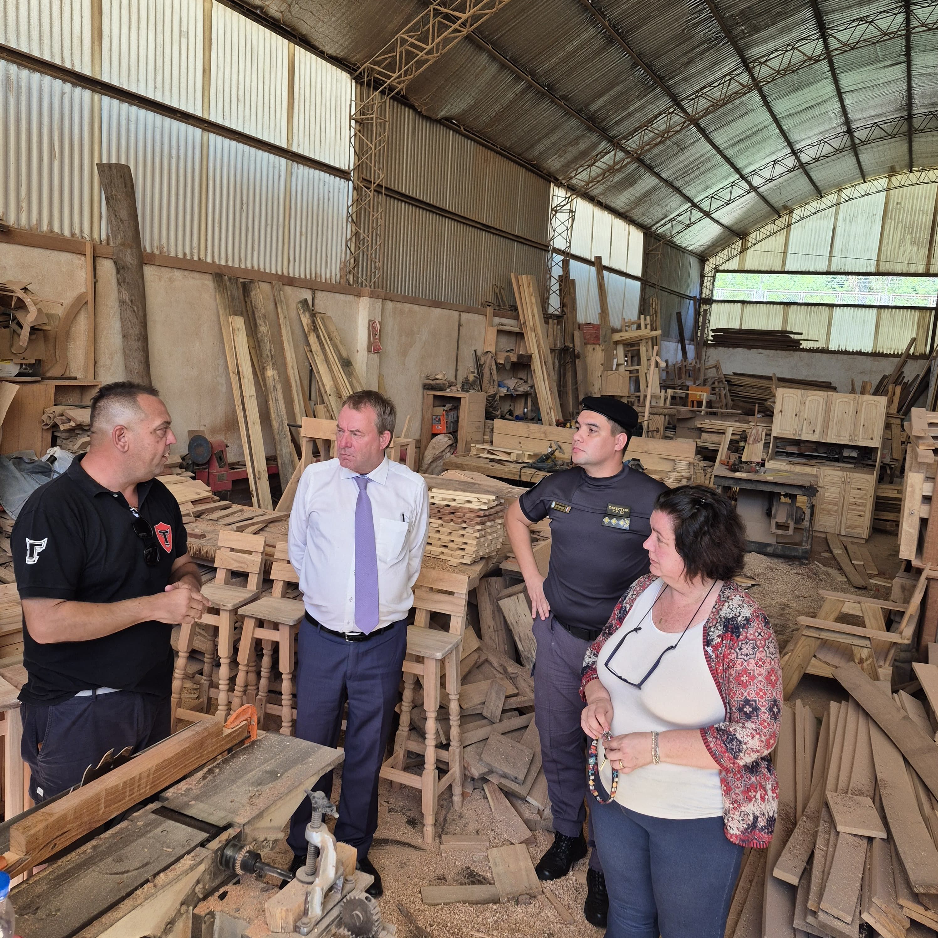 Luego, la delegación ingresó a los talleres y espacios formativos, incluida la carpintería y el área de costura, donde los internos confeccionaban prendas. Allí, según Flores, el interés del diplomático fue especialmente fuerte: “La parte de costura les pareció increíble… anotaron todo, fotografiaron todo”, aseguró, sin descartar futuras colaboraciones de la comitiva alemana.